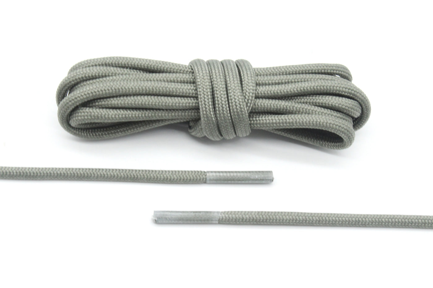 Tired of black? Try out these dark grey olive shoelaces. It has a solid dark grey round knit leading to plastic translucent tips to bring out the attention of the colour.